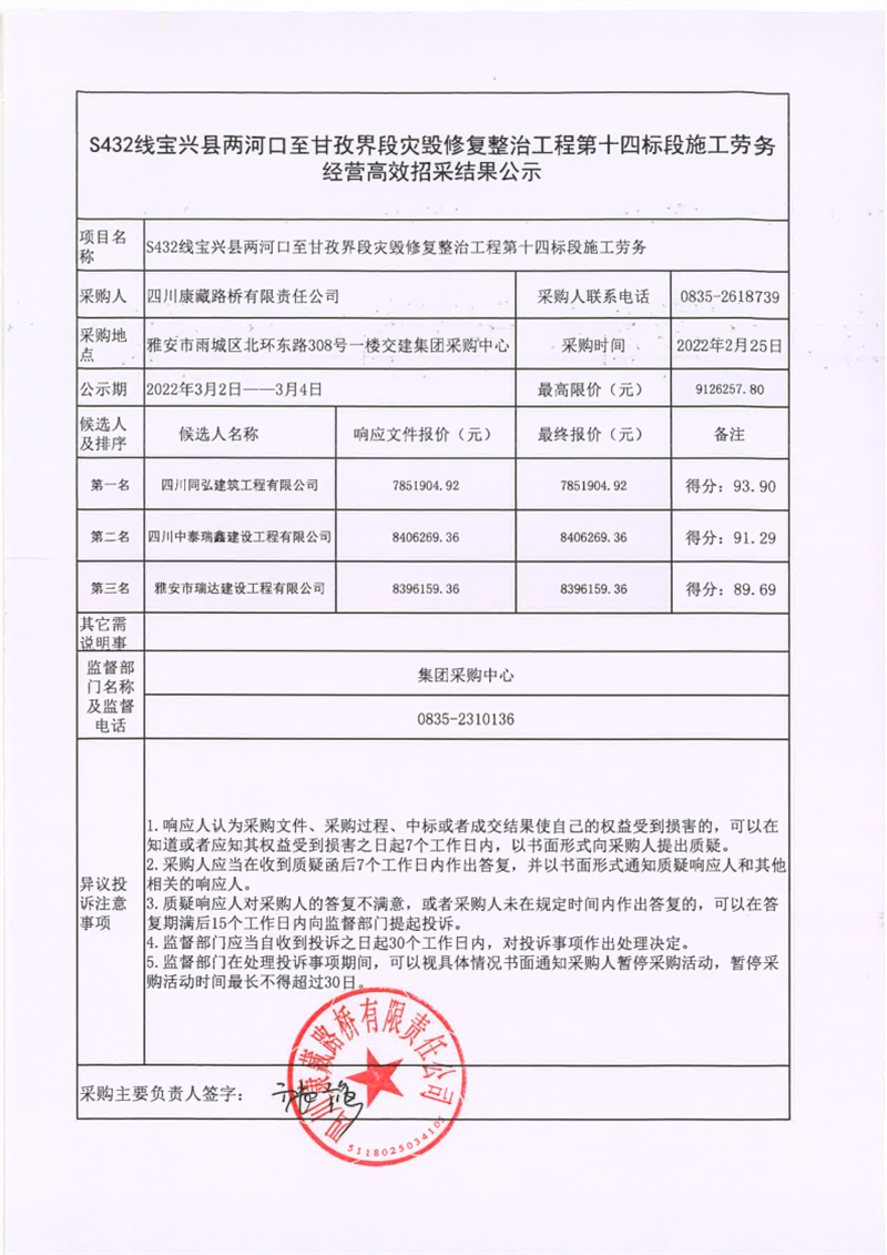四川康藏路橋有限責任公司S432線寶興縣兩河口至甘孜界段災毀修復整治工程第十四標段施工勞務經(jīng)營高效招采結(jié)果公示