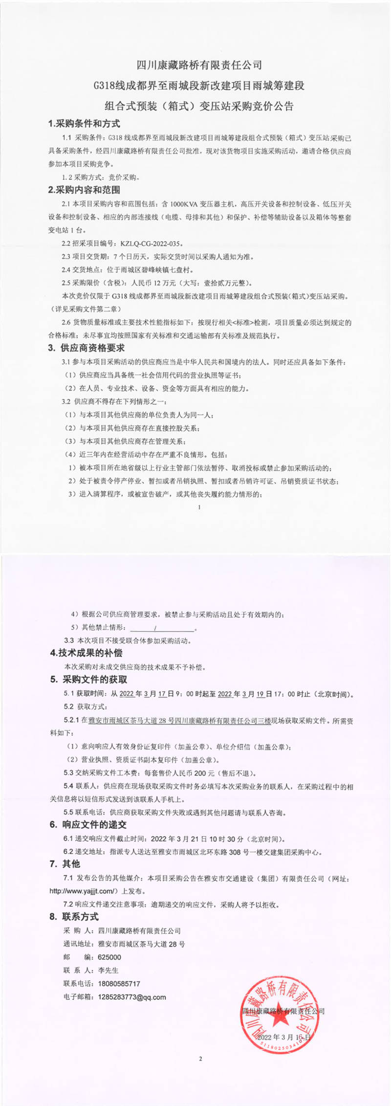 四川康藏路橋有限責任公司G318線成都界至雨城段新改建項目雨城籌建段組合式預裝(箱式)變壓站采購競價公告