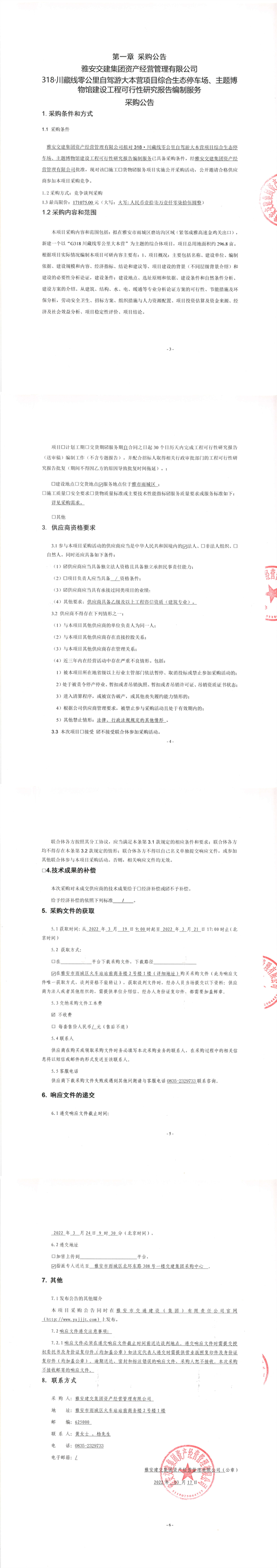 雅安交建集團(tuán)資產(chǎn)經(jīng)營管理有限公司318.川藏線零公里自駕游大本營項目綜合生態(tài)停車場、主題博物館建設(shè)工程可行性研究報告編制服務(wù)采購公告