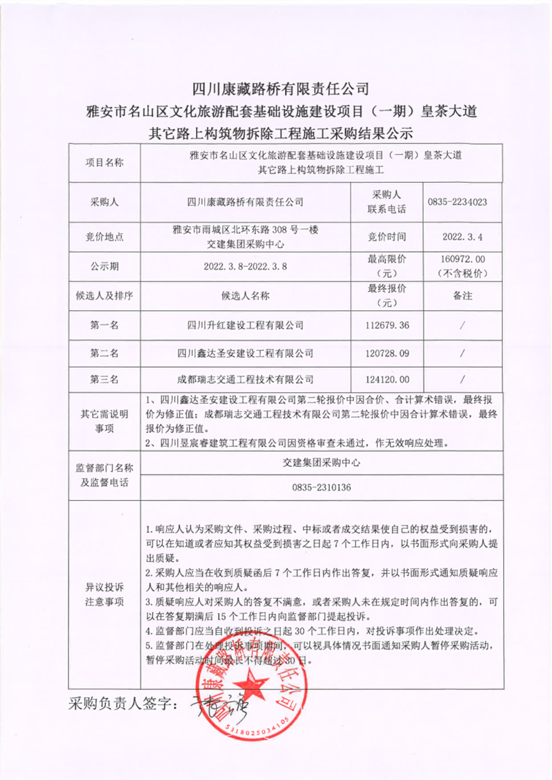 四川康藏路橋有限責(zé)任公司雅安市名山區(qū)文化旅游配套基礎(chǔ)設(shè)施建設(shè)項(xiàng)目(一期)皇茶大道其它路上構(gòu)筑物拆除工程施工采購(gòu)結(jié)果公示