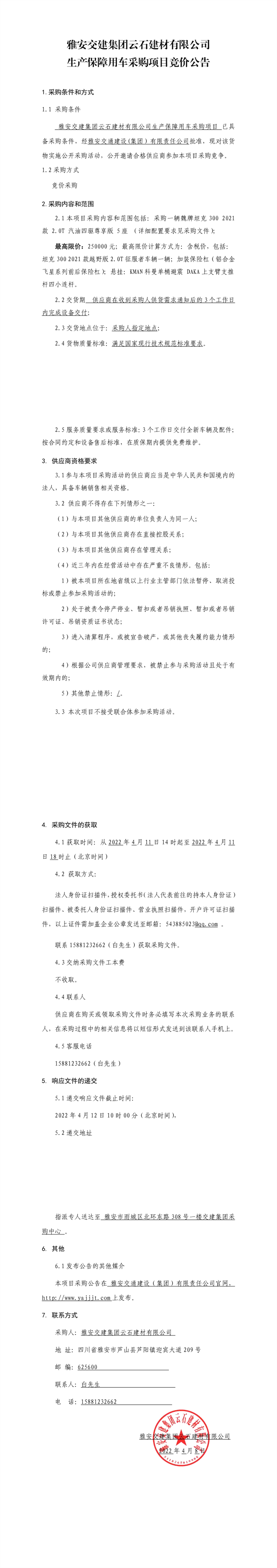 雅安交建集團(tuán)云石建材有限公司生產(chǎn)保障用車(chē)采購(gòu)項(xiàng)目競(jìng)價(jià)公告