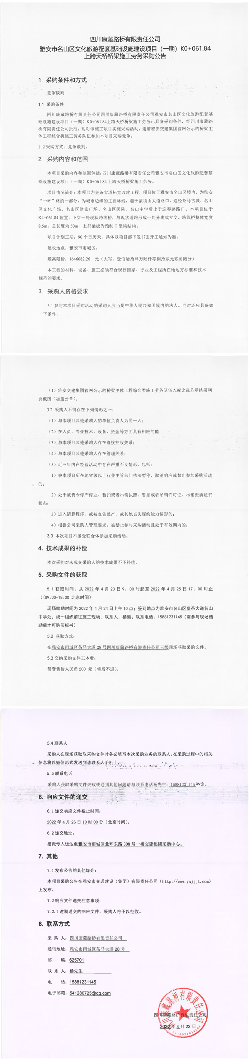 四川康藏路橋有限責(zé)任公司雅安市名山區(qū)文化旅游配套基礎(chǔ)設(shè)施建設(shè)項(xiàng)目(一期)K0+061.84上跨天橋橋梁施工勞務(wù)采購(gòu)公告