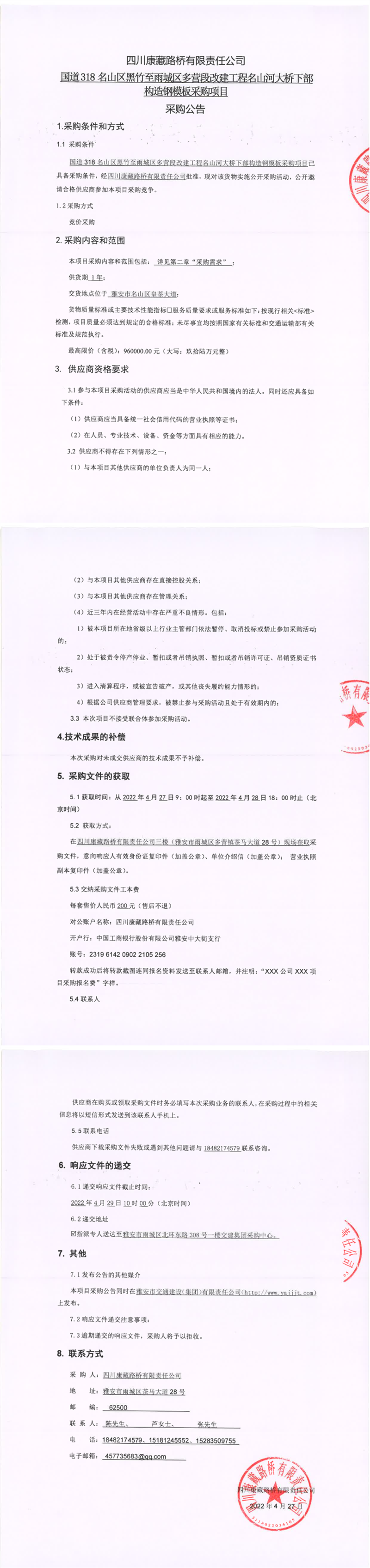 四川康藏路橋有限責任公司國道318名山區(qū)黑竹至雨城區(qū)多營段改建工程名山河大橋下部構(gòu)造鋼模板采購項目采購公告