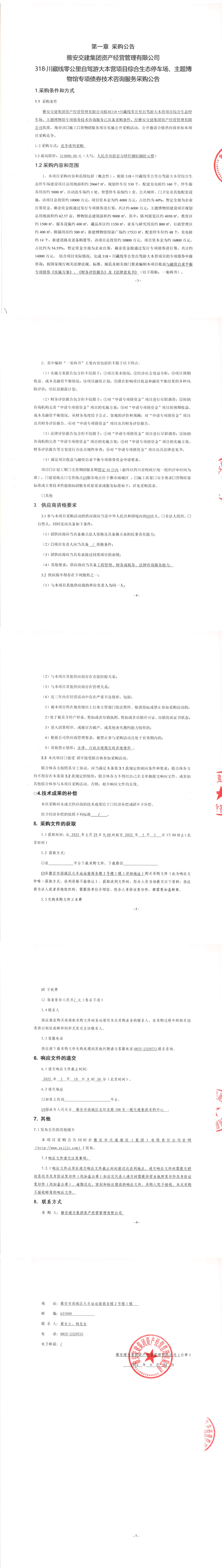 雅安交建集團(tuán)資產(chǎn)經(jīng)營(yíng)管理有限公司318.川藏線零公里自駕游大本營(yíng)項(xiàng)目綜合生態(tài)停車場(chǎng)、主題博物館專項(xiàng)債券技術(shù)咨詢服務(wù)采購(gòu)公告
