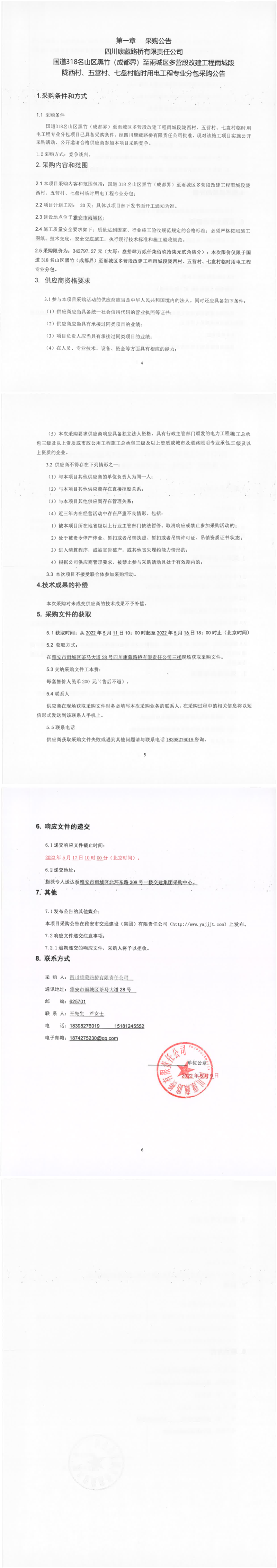 四川康藏路橋有限責任公司G318線成都界至雨城段新改建項目名山段臨時用電工程專業(yè)分包采購公告