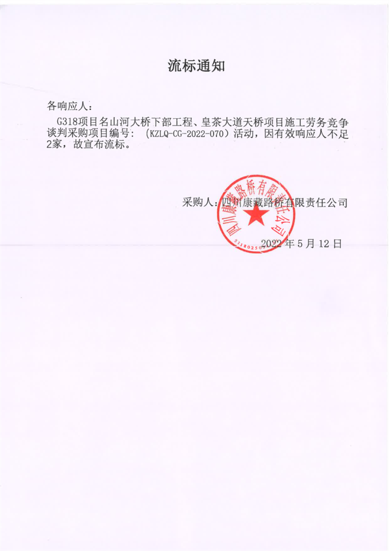四川康藏路橋有限責(zé)任公司G318項(xiàng)目名山河大橋下部工程、皇茶大道天橋項(xiàng)目施工勞務(wù)談判采購(gòu)項(xiàng)目流標(biāo)通知