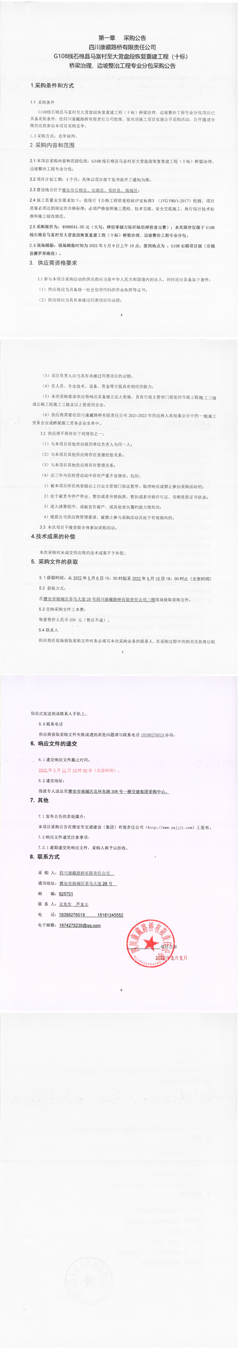 四川康藏路橋有限責(zé)任公司G108線石棉縣馬富村至大營盤段恢復(fù)重建工程(十標(biāo))橋梁治理、邊坡整治工程專業(yè)分包采購公告
