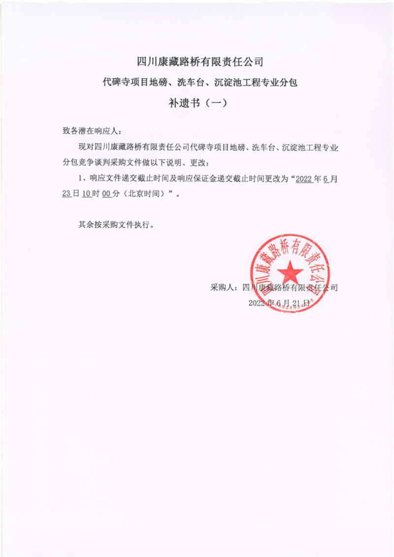 四川康藏路橋有限責(zé)任公司代碑寺項目地磅、洗車臺、沉淀池工程專業(yè)分包補(bǔ)遺書(一)