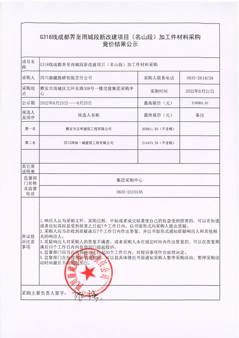 四川康藏路橋有限責(zé)任公司G318線成都界至雨城段新改建項(xiàng)目(名山段)加工件材料采購競價結(jié)果公示