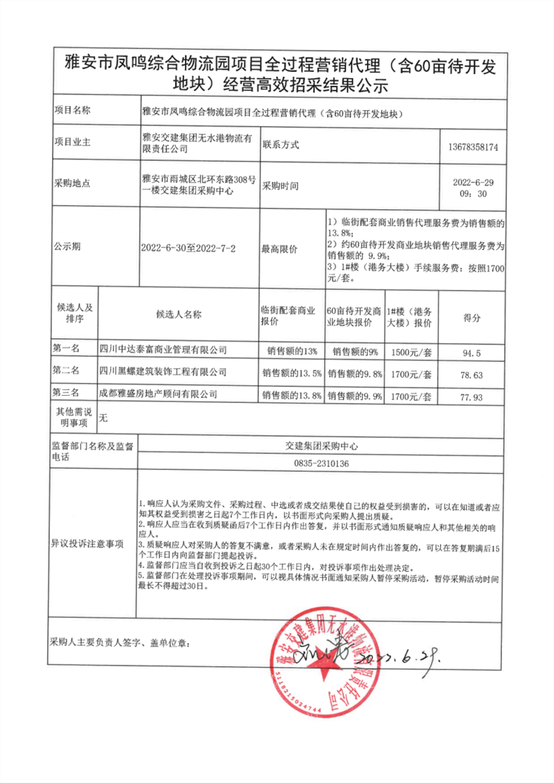 雅安交建集團(tuán)無水港物流有限責(zé)任公司雅安市鳳鳴綜合物流園項目全過程營銷代理(含60畝待開發(fā)地塊)經(jīng)營高效招采結(jié)果公示