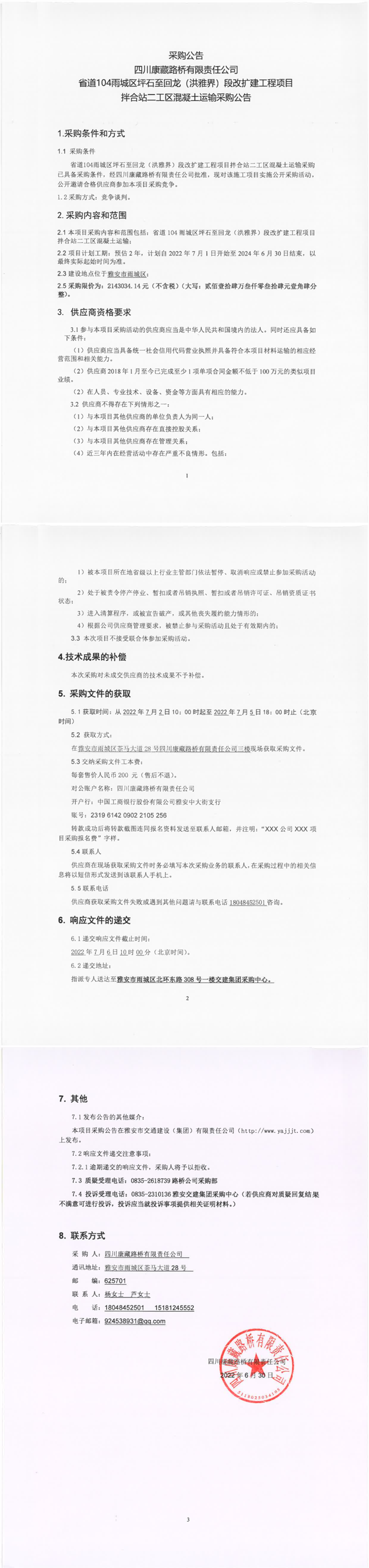 四川康藏路橋有限責(zé)任公司省道104雨城區(qū)坪石至回龍(洪雅界)段改擴(kuò)建工程項(xiàng)目拌合站二工區(qū)混凝土運(yùn)輸采購(gòu)公告