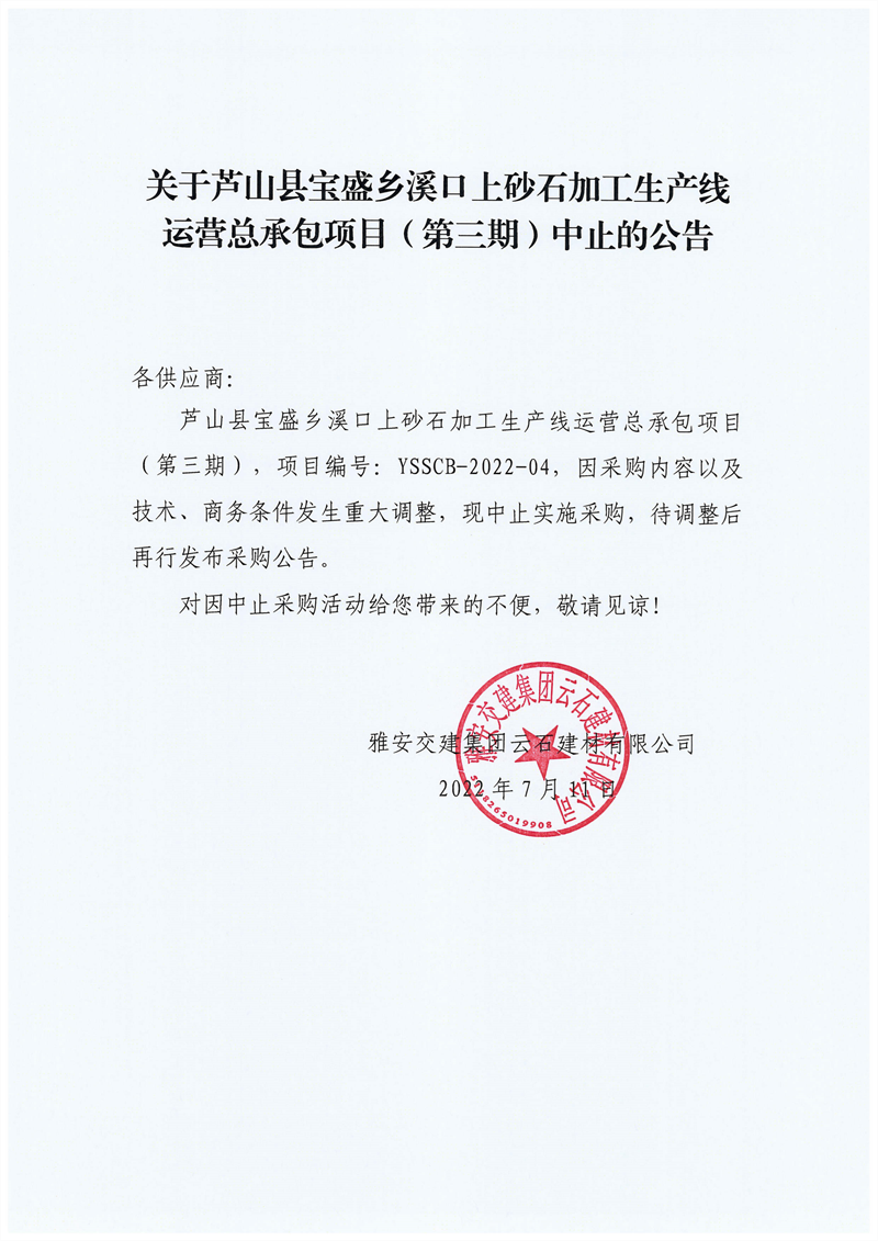 雅安交建集團云石建材有限公司關(guān)于蘆山縣寶盛鄉(xiāng)溪口上砂石加工生產(chǎn)線運營總承包項目(第三期)中止的公告