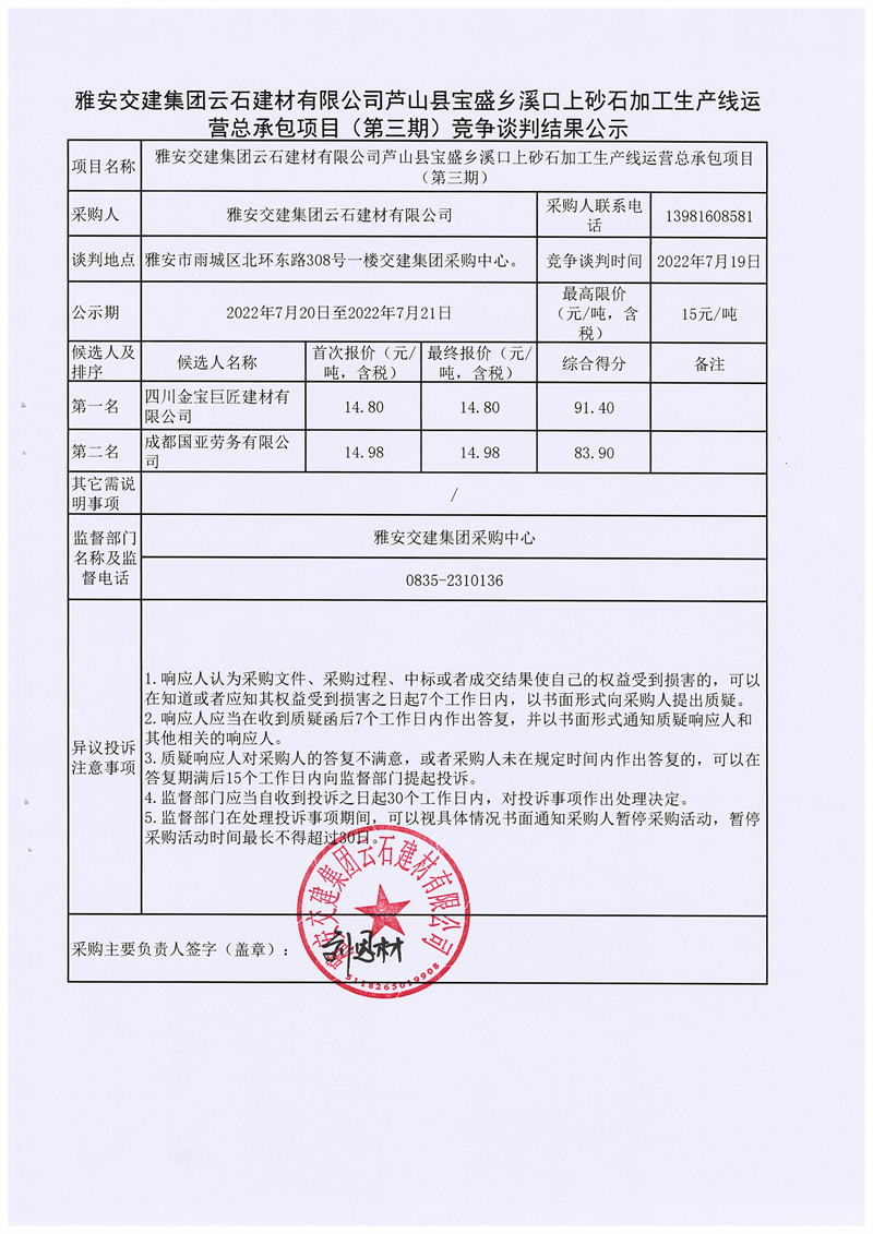 雅安交建集團(tuán)云石建材有限公司蘆山縣寶盛鄉(xiāng)溪口上砂石加工生產(chǎn)線運營總承包項目(第三期)競爭談判結(jié)果公示