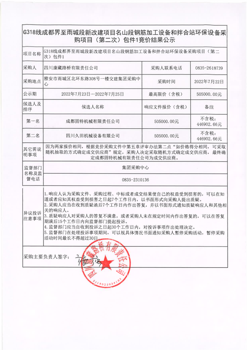 四川康藏路橋有限責任公司G318線成都界至雨城段新改建項目名山段鋼筋加工設(shè)備和拌合站環(huán)保設(shè)備采購項目(第二次)包件1競價結(jié)果公示