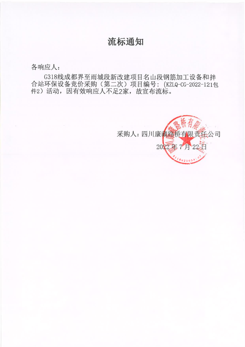 四川康藏路橋有限責(zé)任公司G318線成都界至雨城段新改建項(xiàng)目名山段鋼筋加工設(shè)備和拌合站環(huán)保設(shè)備競(jìng)價(jià)采購(gòu)(第二次)包件2流標(biāo)通知