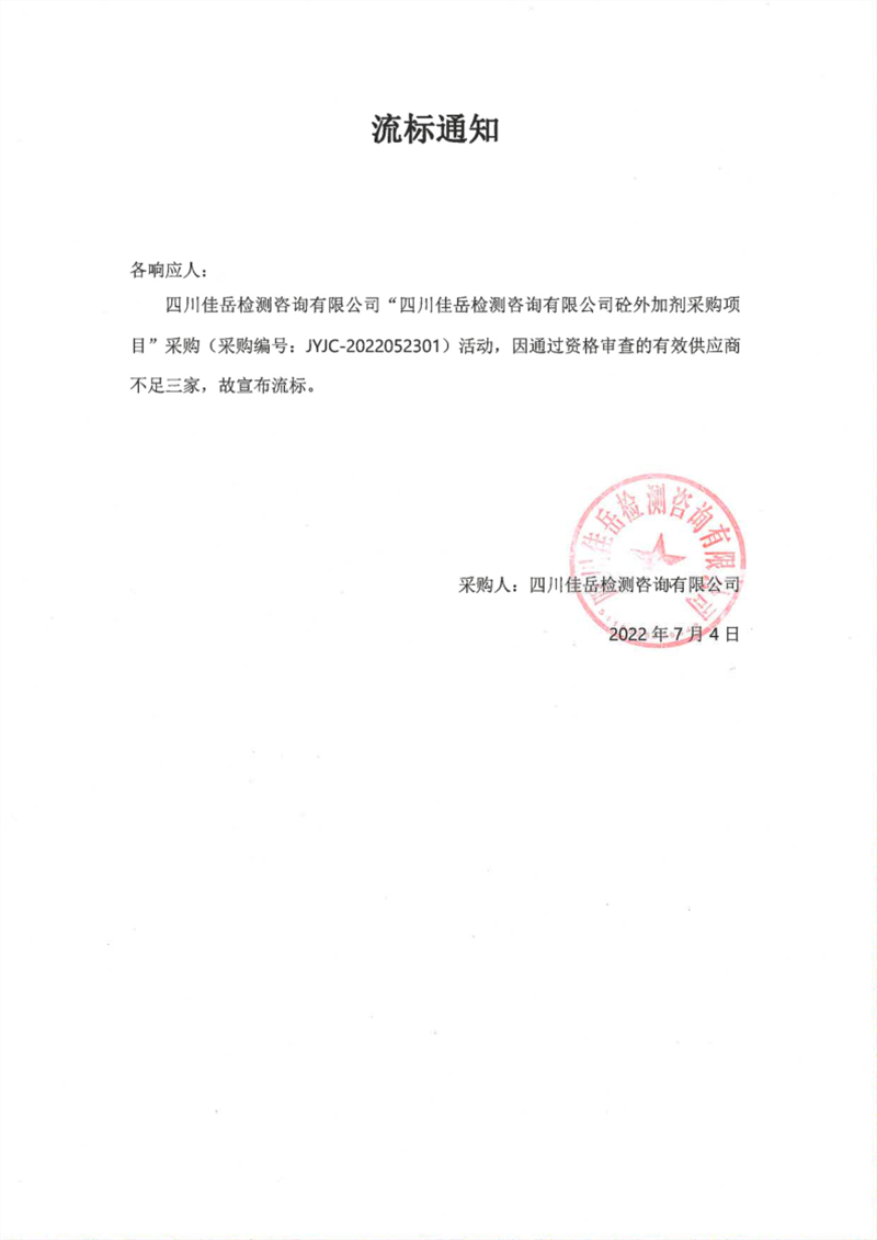 四川佳岳檢測咨詢有限公司砼外加劑采購項目流標(biāo)通知
