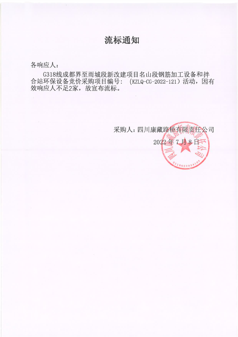 四川康藏路橋有限責(zé)任公司G318線(xiàn)成都界至雨城段新改建項(xiàng)目名山段鋼筋加工設(shè)備和拌合站環(huán)保設(shè)備競(jìng)價(jià)采購(gòu)項(xiàng)目流標(biāo)通知