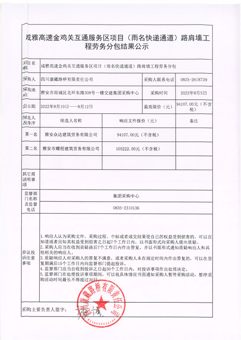 四川康藏路橋有限責(zé)任公司成雅高速金雞關(guān)互通服務(wù)區(qū)項目(雨名快速通道)路肩墻工程勞務(wù)分包結(jié)果公示