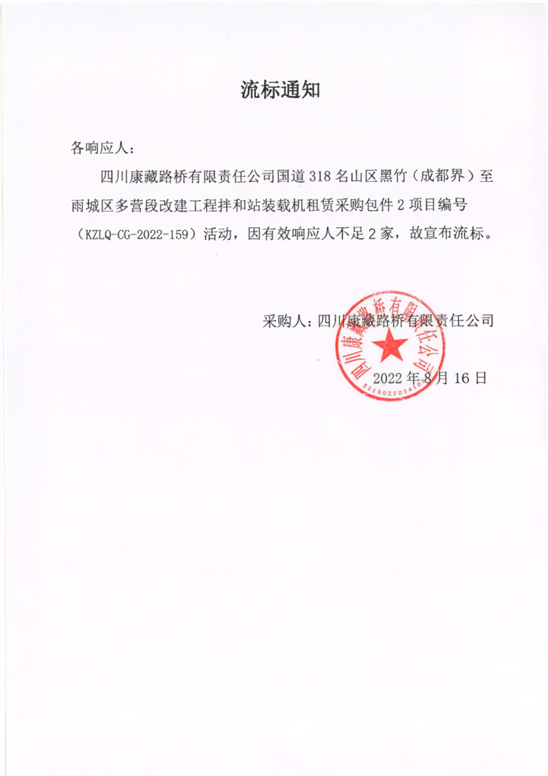 四川康藏路橋有限責(zé)任公司國(guó)道318名山區(qū)黑竹(成都界)至雨城區(qū)多營(yíng)段改建工程拌和站裝載機(jī)租賃采購(gòu)包件2項(xiàng)目流標(biāo)通知