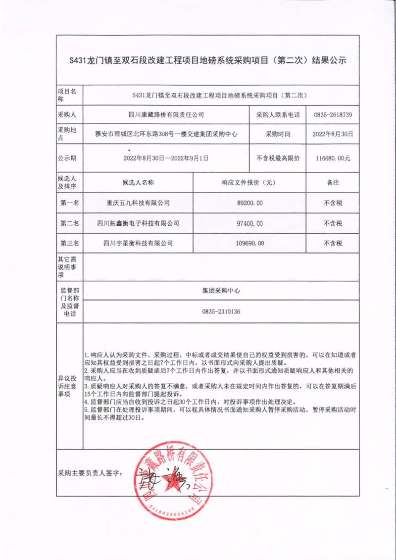 四川康藏路橋有限責(zé)任公司S431龍門(mén)鎮(zhèn)至雙石段改建工程項(xiàng)目地磅系統(tǒng)采購(gòu)項(xiàng)目(第二次)結(jié)果公示