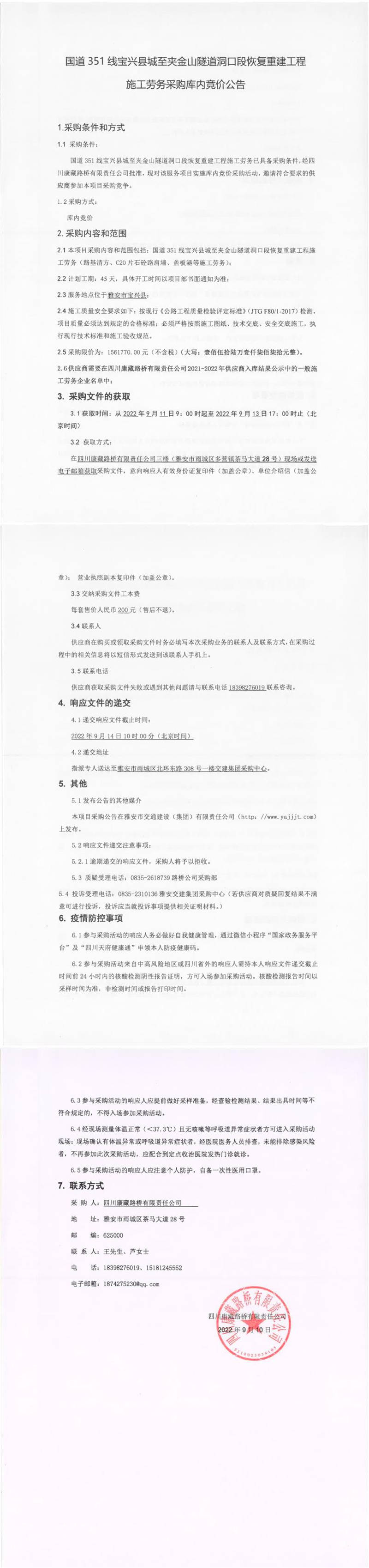 四川康藏路橋有限責(zé)任公司國(guó)道351線寶興縣城至夾金山隧道洞口段恢復(fù)重建工程施工勞務(wù)采購(gòu)庫(kù)內(nèi)競(jìng)價(jià)公告