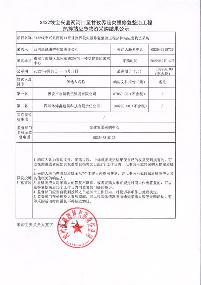 四川康藏路橋有限責任公司S432線寶興縣兩河口至甘孜界段災毀修復整治工程熱拌站應急物資采購結(jié)果公示