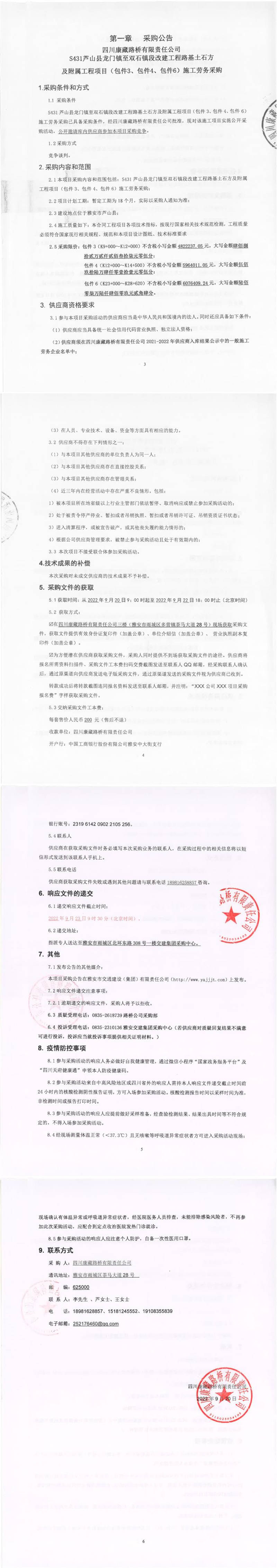 四川康藏路橋有限責(zé)任公司S431蘆山縣龍門(mén)鎮(zhèn)至雙石鎮(zhèn)段改建工程路基土石方及附屬工程項(xiàng)目(包件3、包件4、包件6)施工勞務(wù)采購(gòu)公告