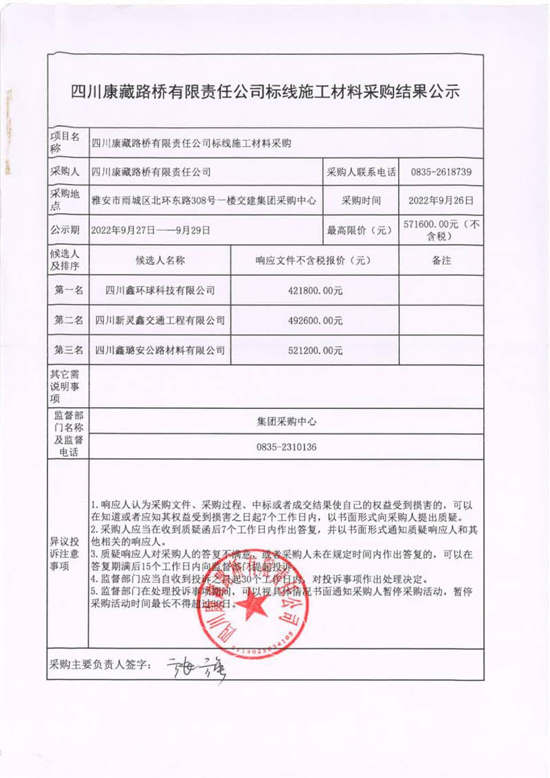 四川康藏路橋有限責任公司標線施工材料采購結(jié)果公示