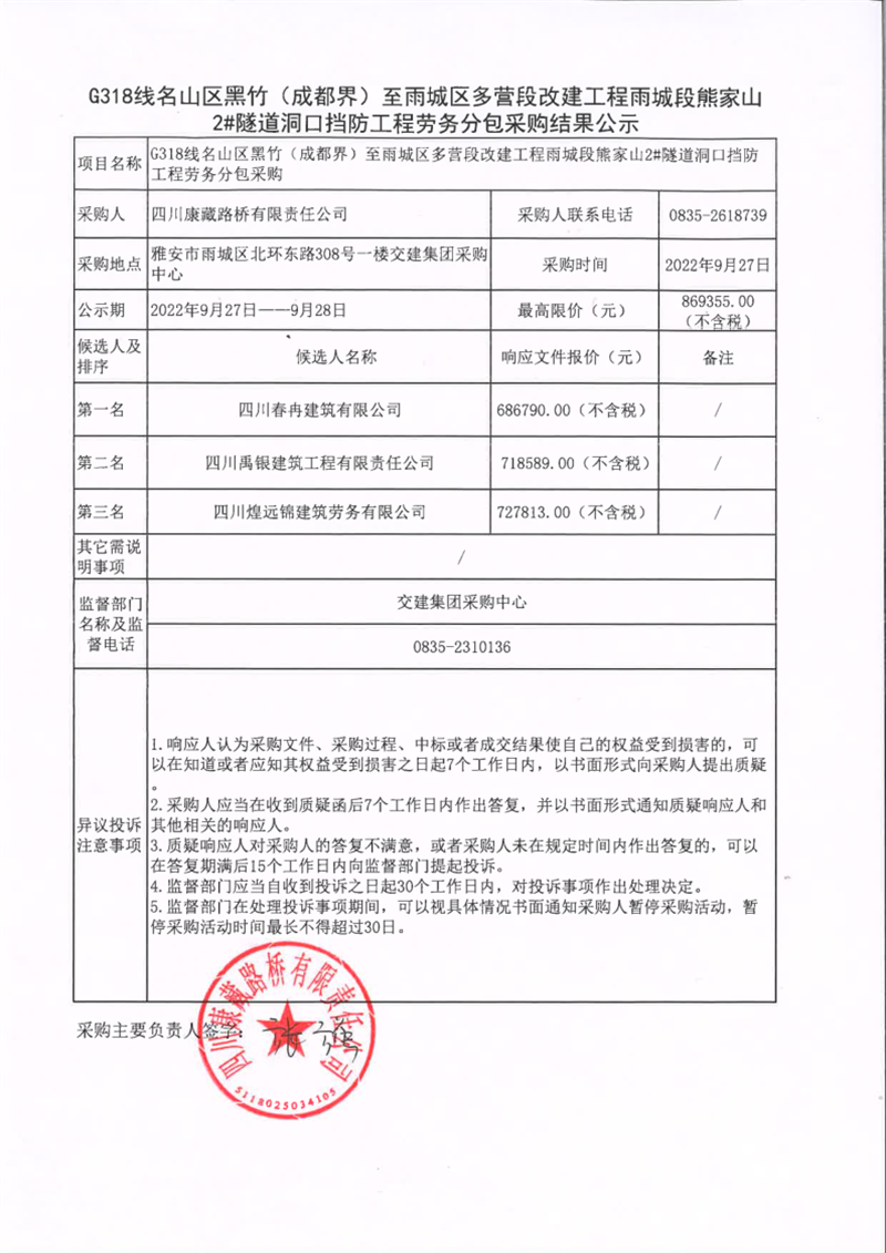 四川康藏路橋有限責任公司G318線名山區(qū)黑竹(成都界)至雨城區(qū)多營段改建工程雨城段熊家山2#隧道洞口擋防工程勞務分包采購結(jié)果公示