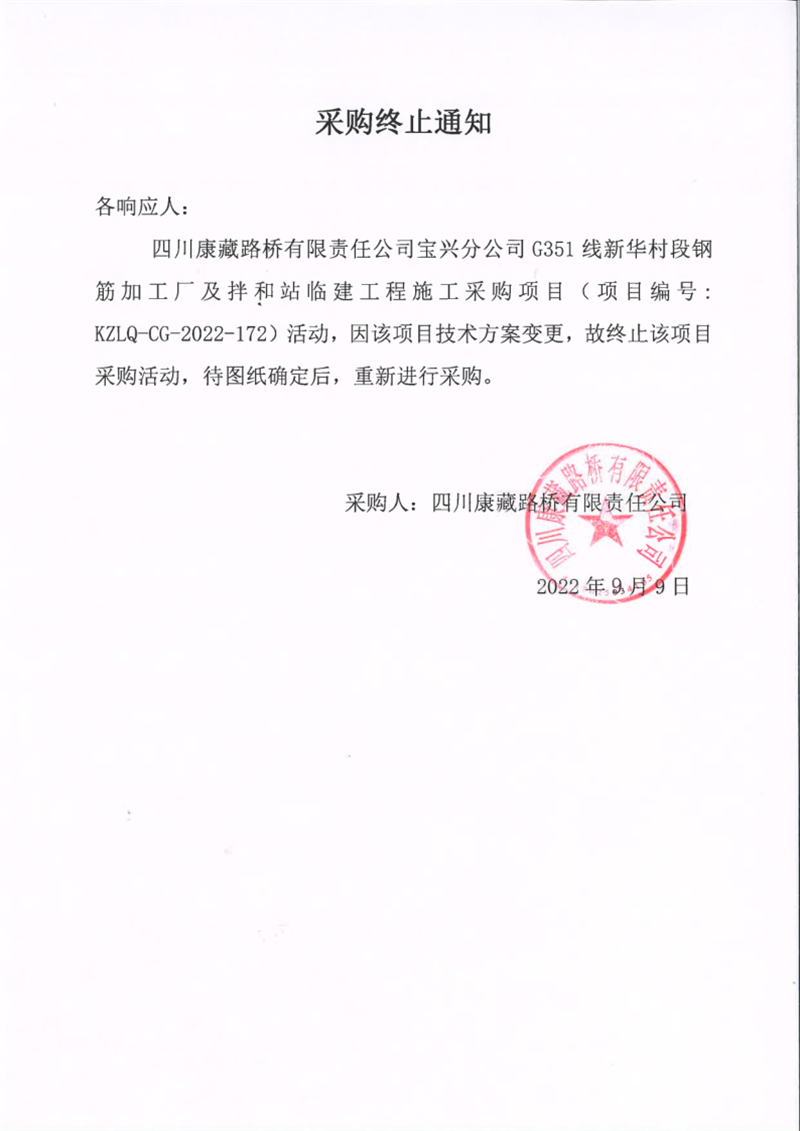 四川康藏路橋有限責(zé)任公司寶興分公司G351線新華村段鋼筋加工廠及拌合站臨建工程施工采購項(xiàng)目采購終止通知