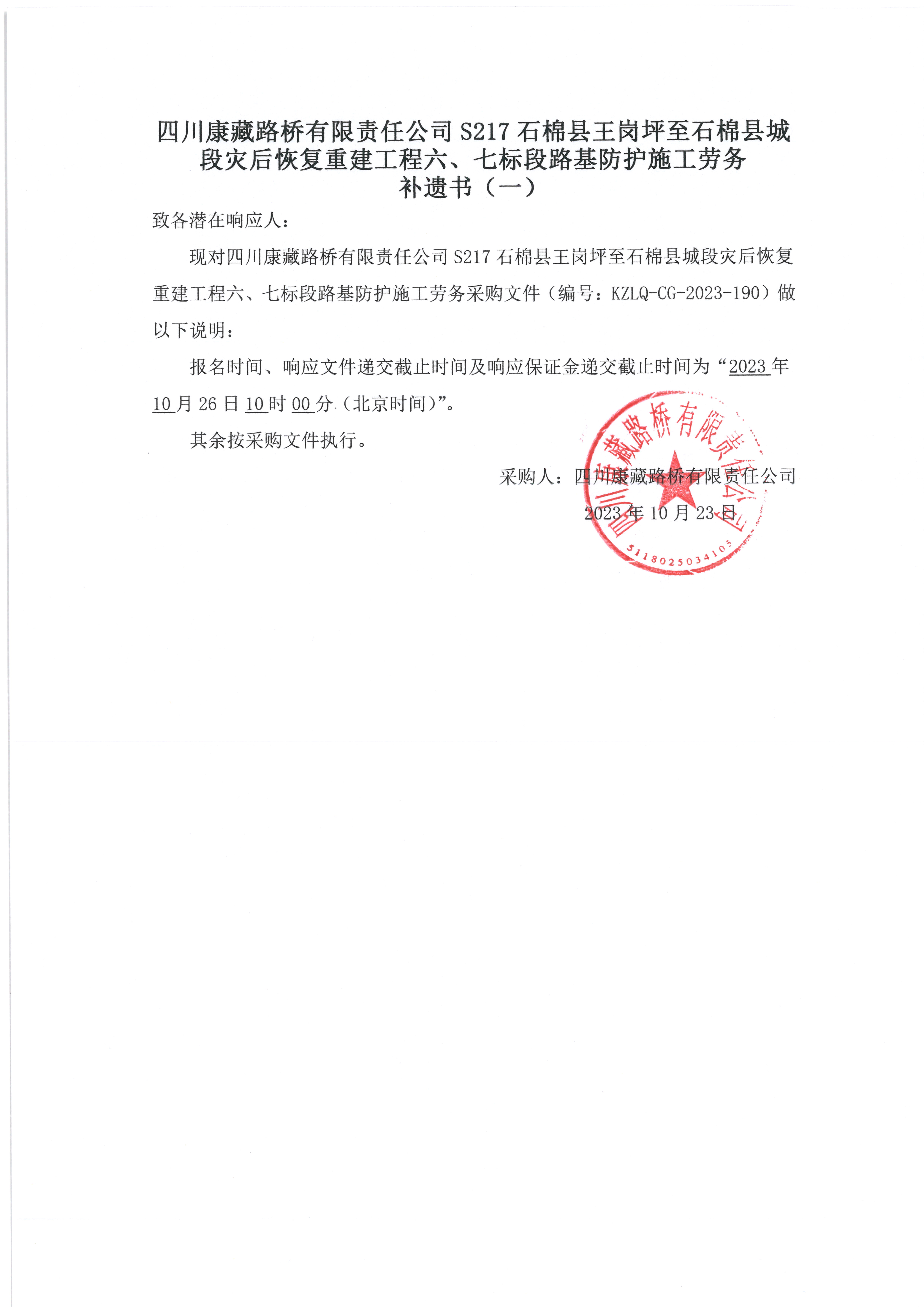 四川康藏路橋有限責(zé)任公司S217石棉縣王崗坪至石棉縣城段災(zāi)后恢復(fù)重建工程六、七標(biāo)段路基防護(hù)施工勞務(wù) 補(bǔ)遺書(一)
