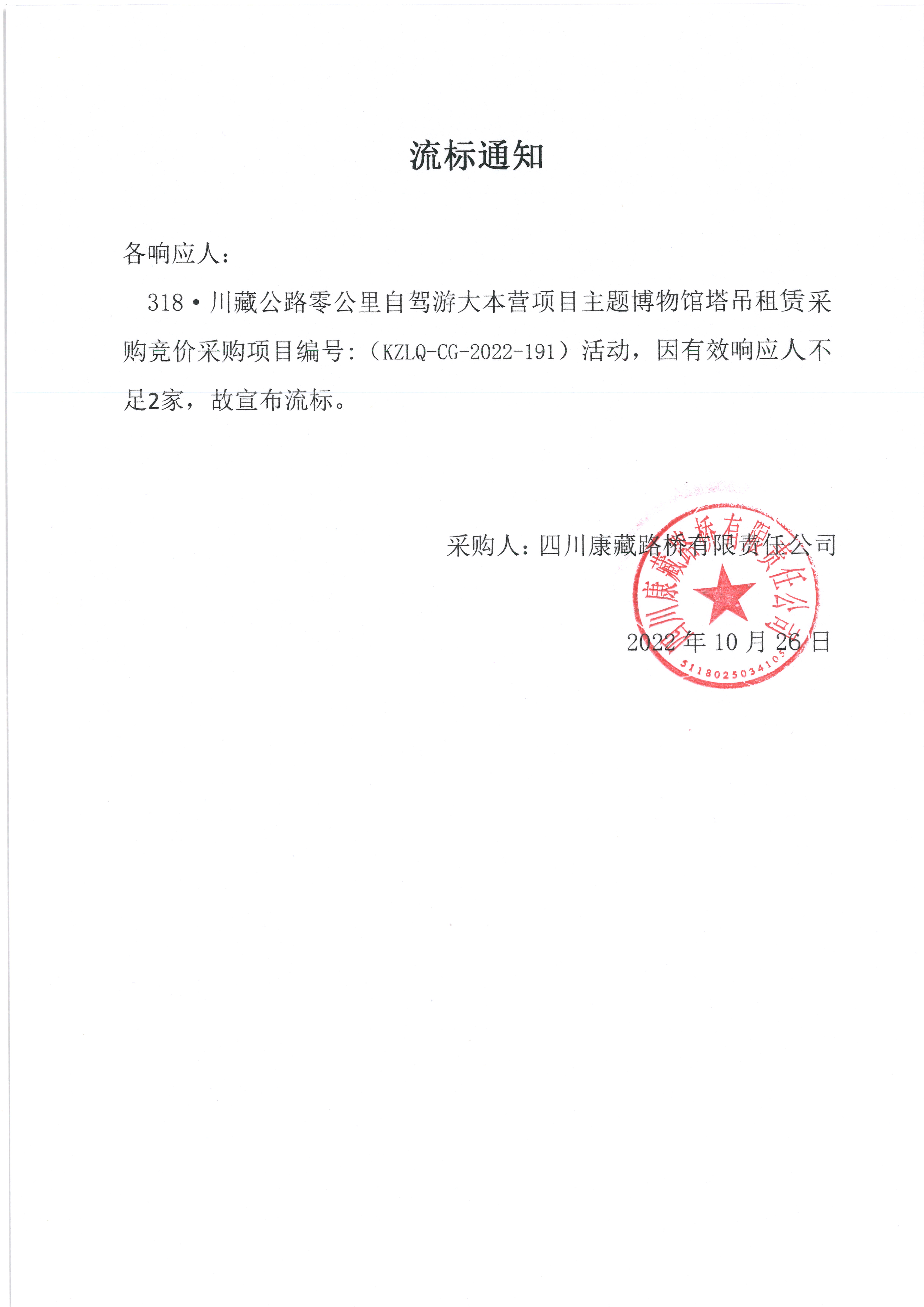 四川康藏路橋有限責(zé)任公司318·川藏公路零公里自駕游大本營項(xiàng)目主題博物館塔吊租賃采購流標(biāo)通知
