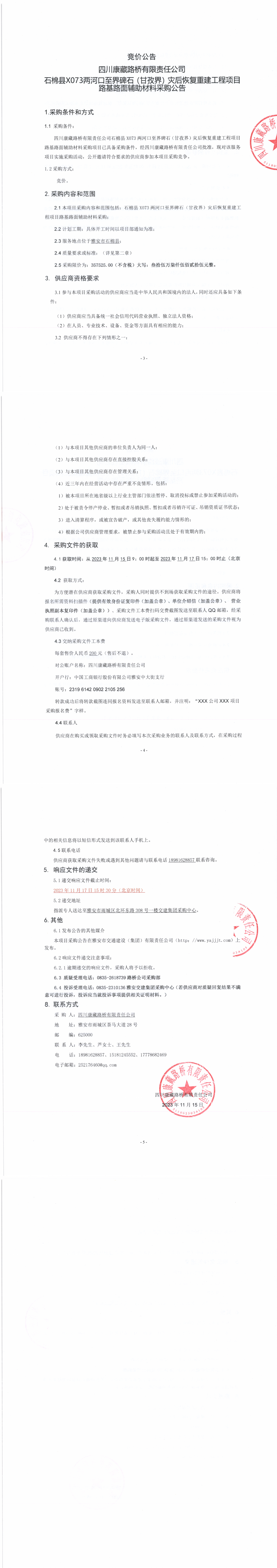 四川康藏路橋有限責(zé)任公司石棉縣X073兩河口至界碑石(甘孜界)災(zāi)后恢復(fù)重建工程項(xiàng)目路基路面輔助材料采購公告