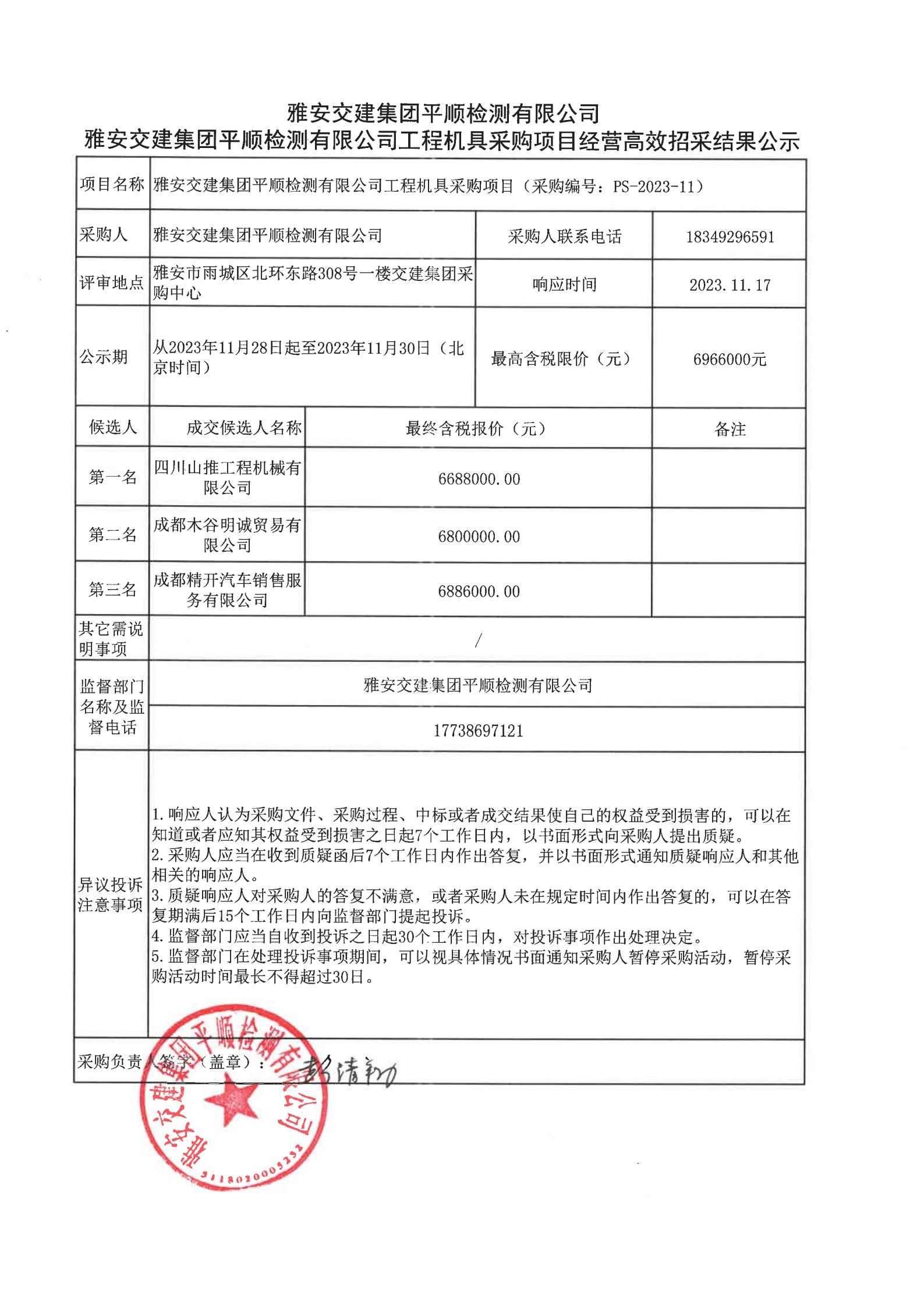 雅安交建集團(tuán)平順檢測有限公司工程機(jī)具采購項目經(jīng)營高效招采結(jié)果公示
