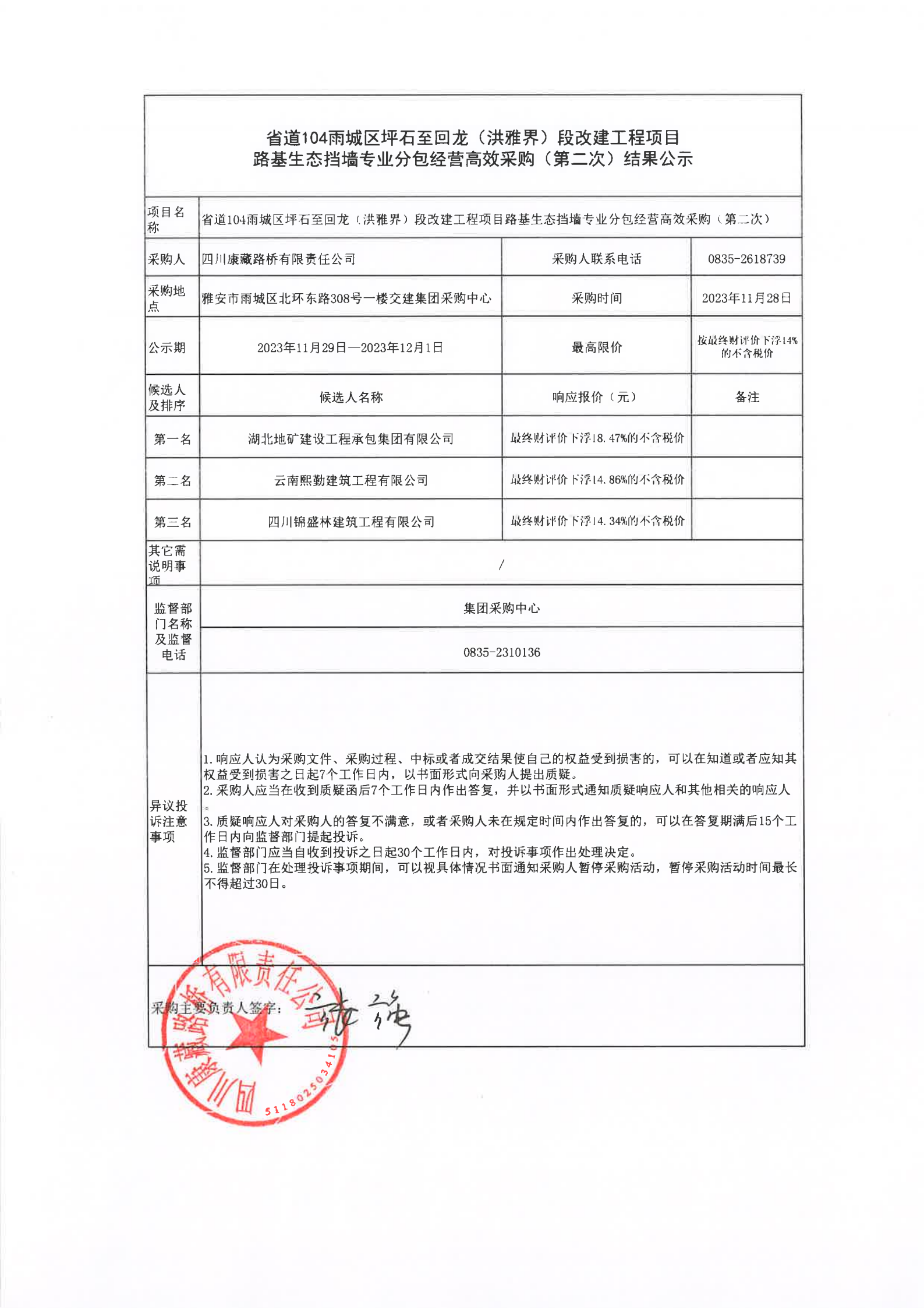四川康藏路橋有限責任公司省道104雨城區(qū)坪石至回龍(洪雅界)段改建工程項目路基生態(tài)擋墻專業(yè)分包經(jīng)營高效采購(第二次)結(jié)果公示