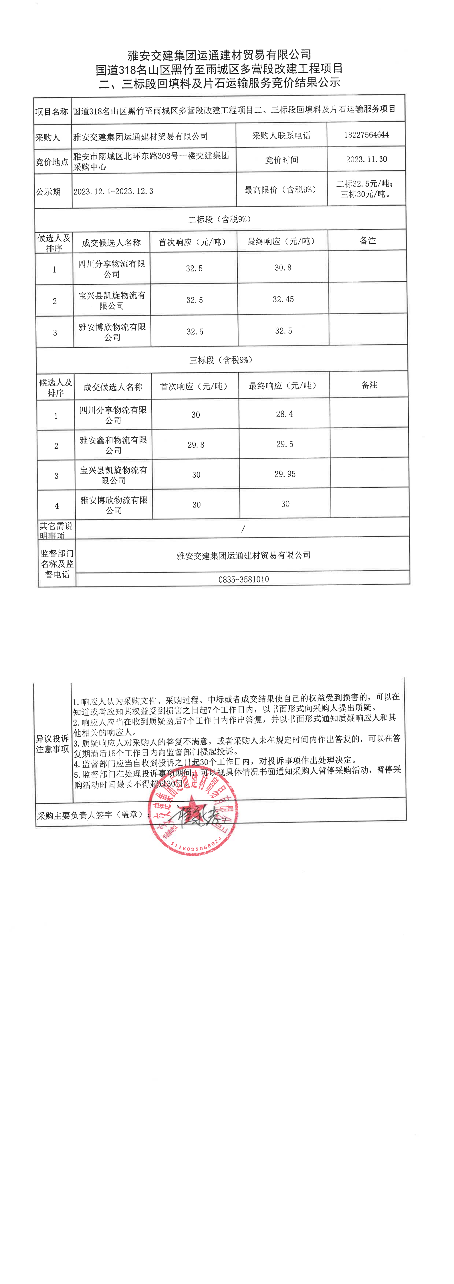 雅安交建集團運通建材貿(mào)易有限公司國道318名山區(qū)黑竹至雨城區(qū)多營段改建工程項目二、三標段回填料、片石運輸服務競價結(jié)果公示