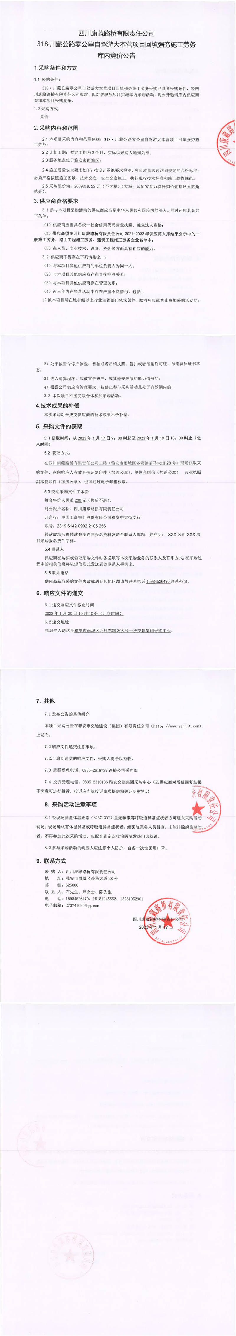四川康藏路橋有限責任公司318.川藏公路零公里自駕游大本營項目回填強夯施工勞務(wù)庫內(nèi)競價公告