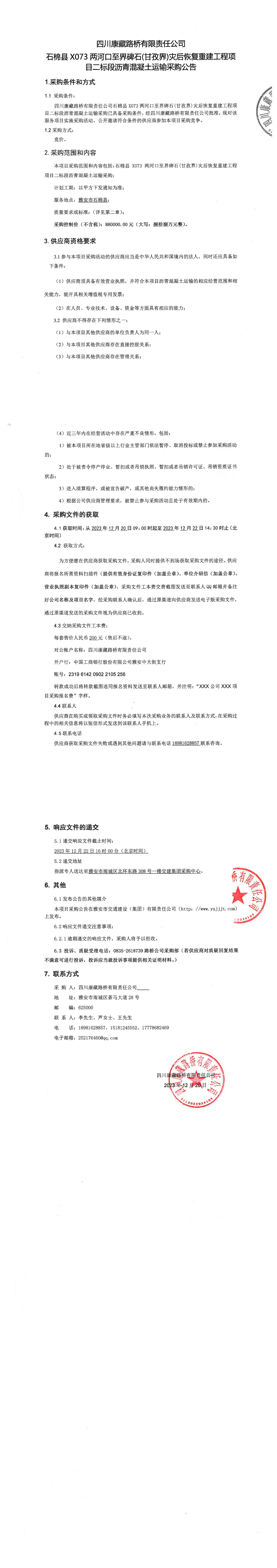 四川康藏路橋有限責(zé)任公司石棉縣X073兩河口至界碑石(甘孜界)災(zāi)后恢復(fù)重建工程項目二標段瀝青混凝土運輸采購公告
