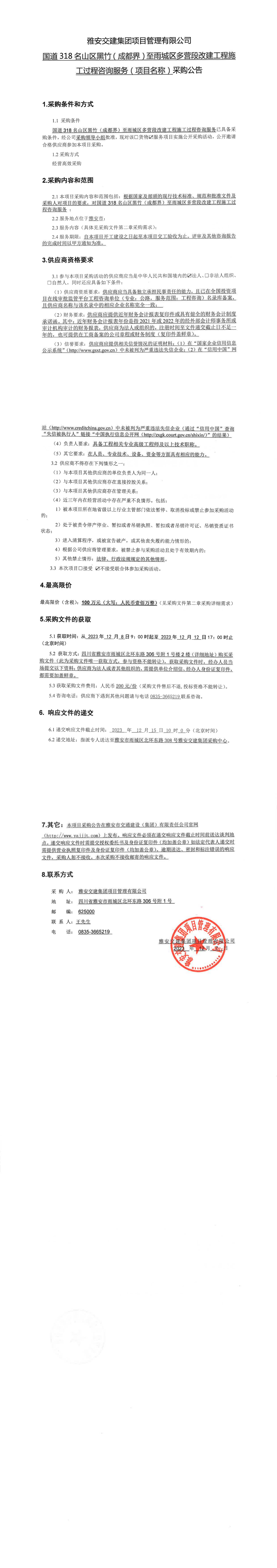 雅安交建集團項目管理有限公司國道318名山區(qū)黑竹(成都界)至雨城區(qū)多營段改建工程施工過程咨詢服務(wù)(項目名稱)采購公告