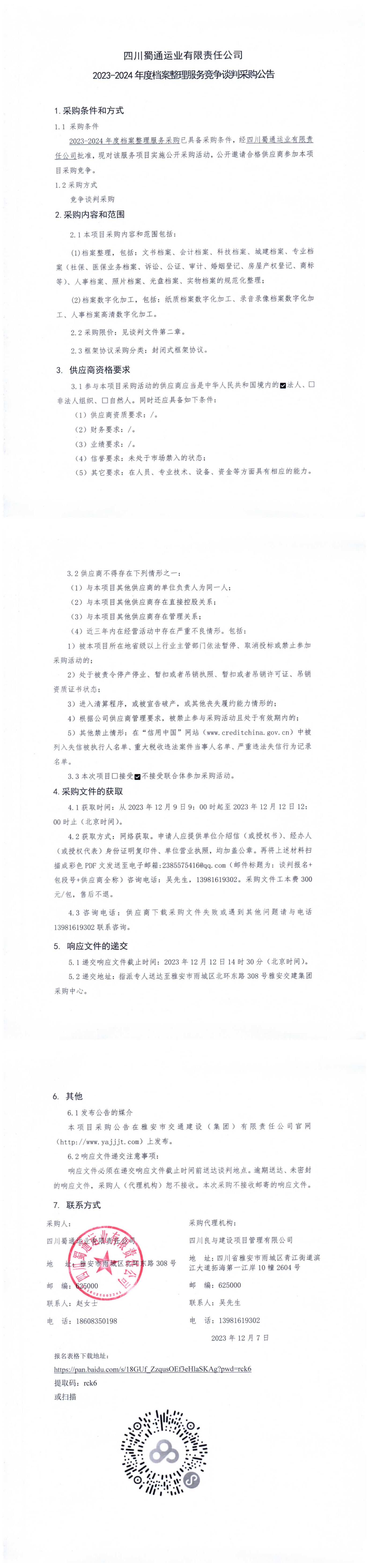 四川蜀通運(yùn)業(yè)有限責(zé)任公司2023-2024年度檔案整理服務(wù)競爭談判采購公告