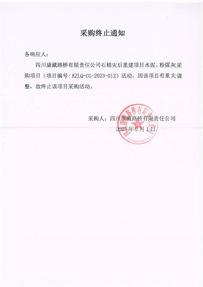 四川康藏路橋有限責(zé)任公司石棉災(zāi)后重建項(xiàng)目水泥、粉煤灰采購項(xiàng)目采購終止通知