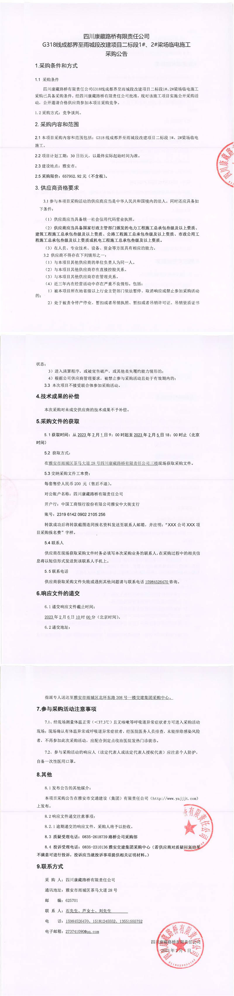 四川康藏路橋有限責(zé)任公司G318線成都界至雨城段改建項(xiàng)目二標(biāo)段1#、2#梁場(chǎng)臨電施工采購公告