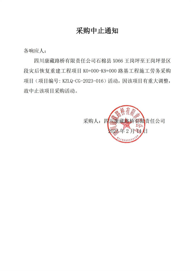 四川康藏路橋有限責任公司石棉縣X066王崗坪至王崗坪景區(qū)段災后恢復重建工程項目K0+000-K9+000路基工程施工勞務采購中止公告