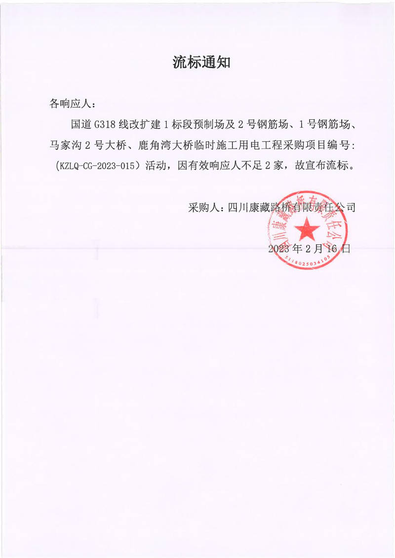 四川康藏路橋有限責(zé)任公司國道G318線改擴(kuò)建1標(biāo)段預(yù)制場及2號(hào)鋼筋場、1號(hào)鋼筋場、馬家溝2號(hào)大橋、鹿角灣大橋臨時(shí)施工用電工程采購項(xiàng)目流標(biāo)通知