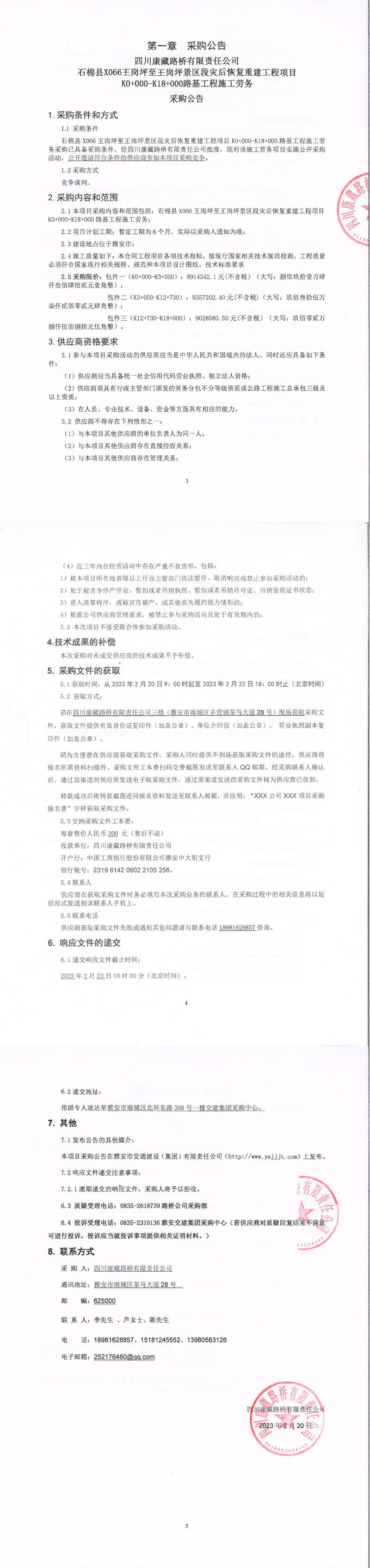 四川康藏路橋有限責(zé)任公司石棉縣X066王崗坪至王崗坪景區(qū)段災(zāi)后恢復(fù)重建工程項(xiàng)目土石方工程、排水工程、邊坡治理工程、防護(hù)工程施工勞務(wù)采購公告