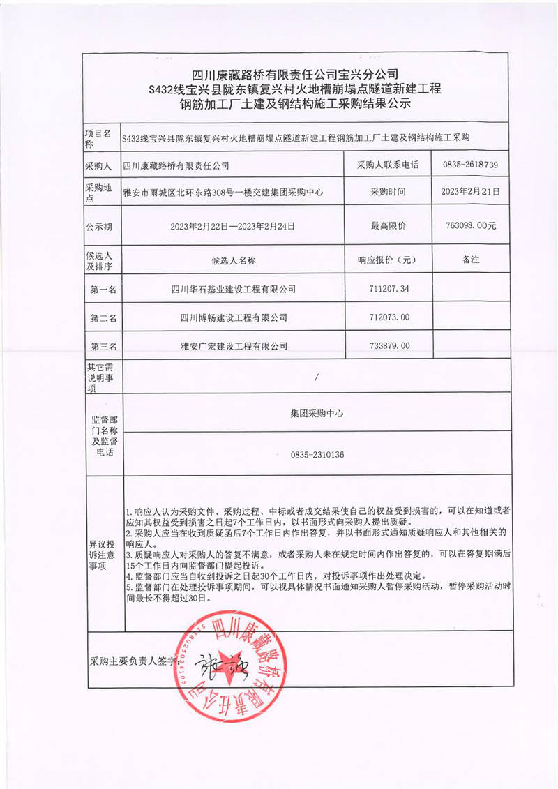 四川康藏路橋有限責(zé)任公司寶興分公司S432寶興縣隴東鎮(zhèn)復(fù)興村火地槽崩塌點(diǎn)隧道新建工程鋼筋加工廠土建及鋼結(jié)構(gòu)施工采購結(jié)果公示