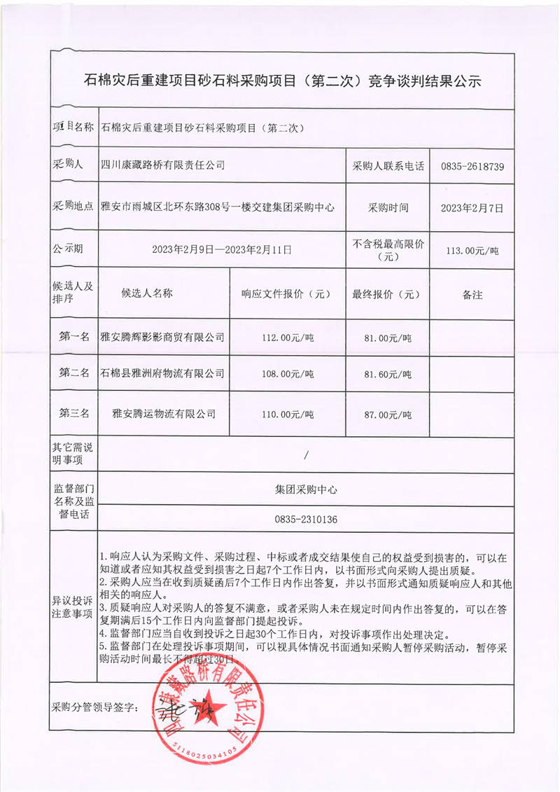 四川康藏路橋有限責任公司石棉災后重建項目砂石料采購項目(第二次)競爭談判結果公示