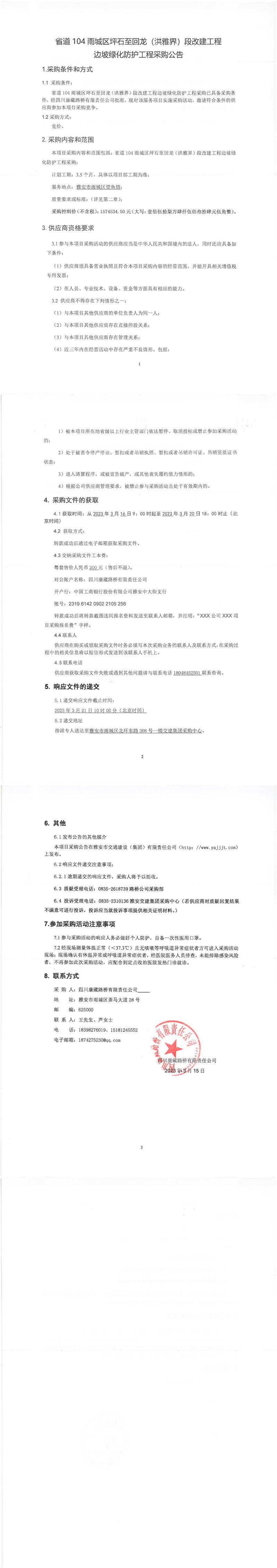 四川康藏路橋有限責任公司省道104雨城區(qū)坪石至回龍(洪雅界)段改建工程邊坡綠化防護工程采購公告