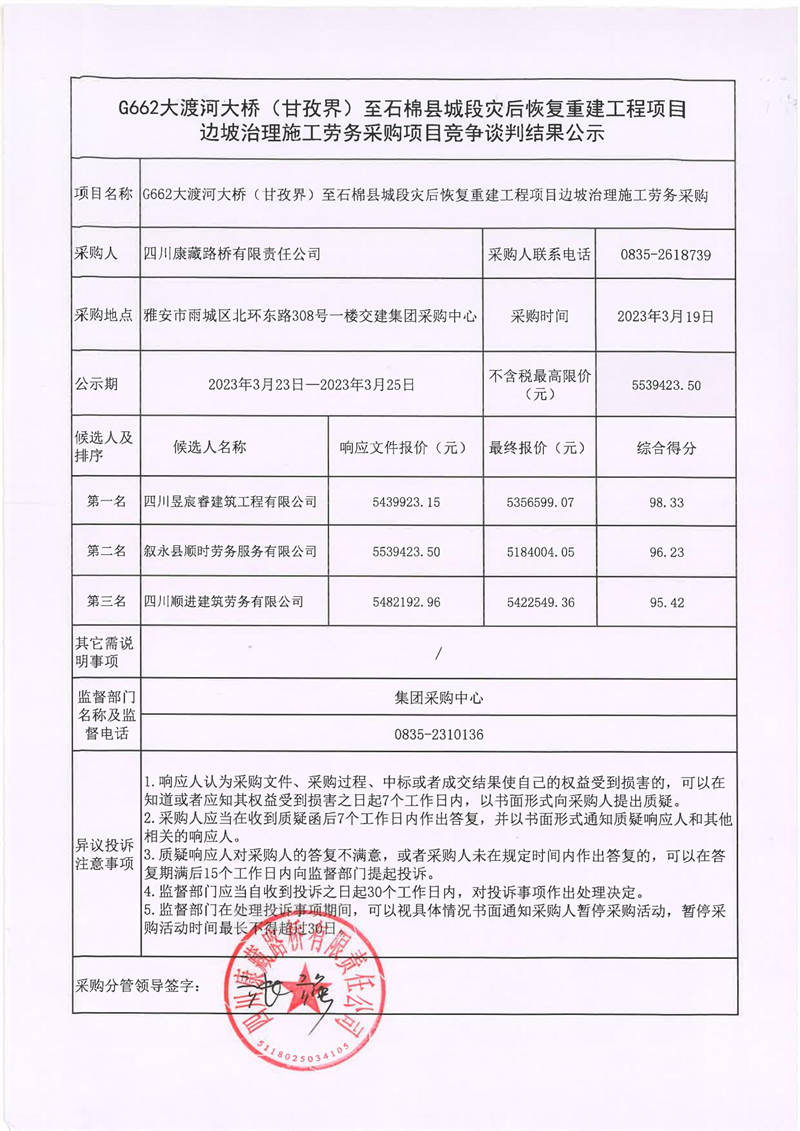 四川康藏路橋有限責(zé)任公司G662大渡河大橋(甘孜界)至石棉縣城段災(zāi)后恢復(fù)重建工程項(xiàng)目邊坡治理施工勞務(wù)采購(gòu)項(xiàng)目競(jìng)爭(zhēng)談判結(jié)果公示