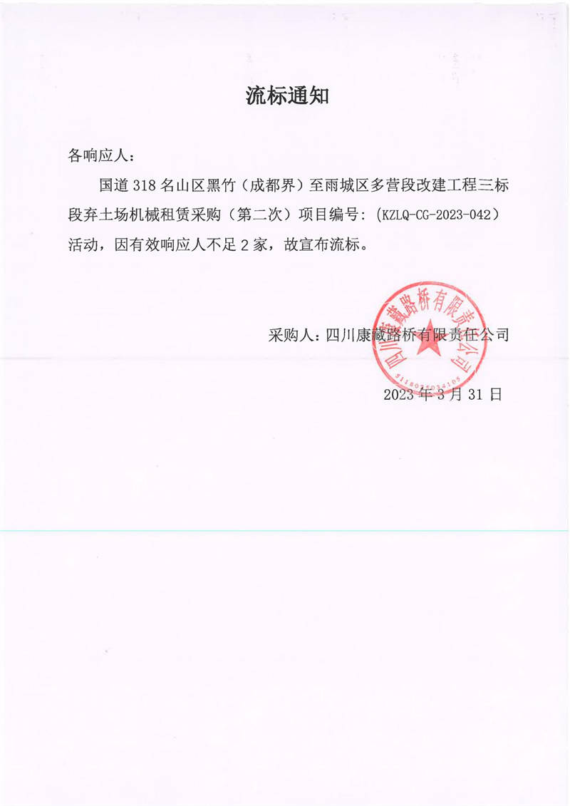四川康藏路橋有限責(zé)任公司國道318名山區(qū)黑竹(成都界)至雨城區(qū)多營段改建工程三標(biāo)段棄土場機(jī)械租賃采購流標(biāo)通知